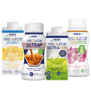 Ergänzend oder alternativ können durch den Arzt / die Ärztin spezielle Resource - Trinknahrungen vorordnet werden. Die verschiedenen Resource Trinknahrungen unterscheiden sich im Gehalt an hochwertigen Proteinen und Energie und können so zielgenau an die Bedürfnisse angepasst werden.